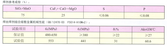 配合H08MnA、H08Mn2、H10Mn2等焊絲,可焊接低碳鋼及低合金鋼(16Mn、15MnTi,15MnV等)結(jié)構(gòu),用于鍋爐及壓力容器的焊接。