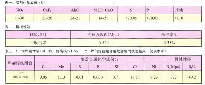 DC·HJ107是熔煉型無錳中硅中氟焊劑。呈藍(lán)灰色至灰黑色浮石狀顆粒,粒度為10-60目(2.0-0.3mm)或8-40目(2.5-0.45mm)。使用直流電源,在較高的電弧電壓下焊接時(shí),熔深較淺,電弧穩(wěn)定,焊縫成型美觀,焊劑消耗量低,易脫渣。由于焊劑中含較多的CaF2,又加入冰晶石,抗氣孔和抗裂縫能力均有提高,在焊劑中加入Cr2O3,既可起到浮石化作用,又可減少不銹鋼焊接過程中Cr的損失。